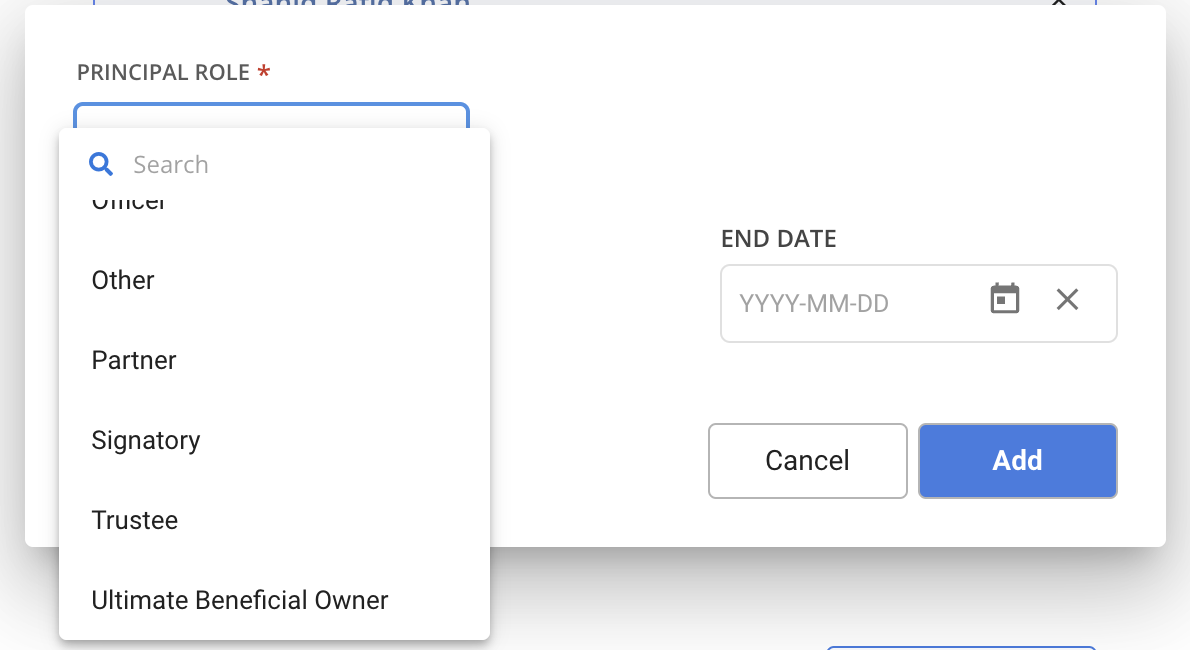 - Click the + Add role button and select Ultimate Beneficial Owner in the PRINCIPAL ROLE field;