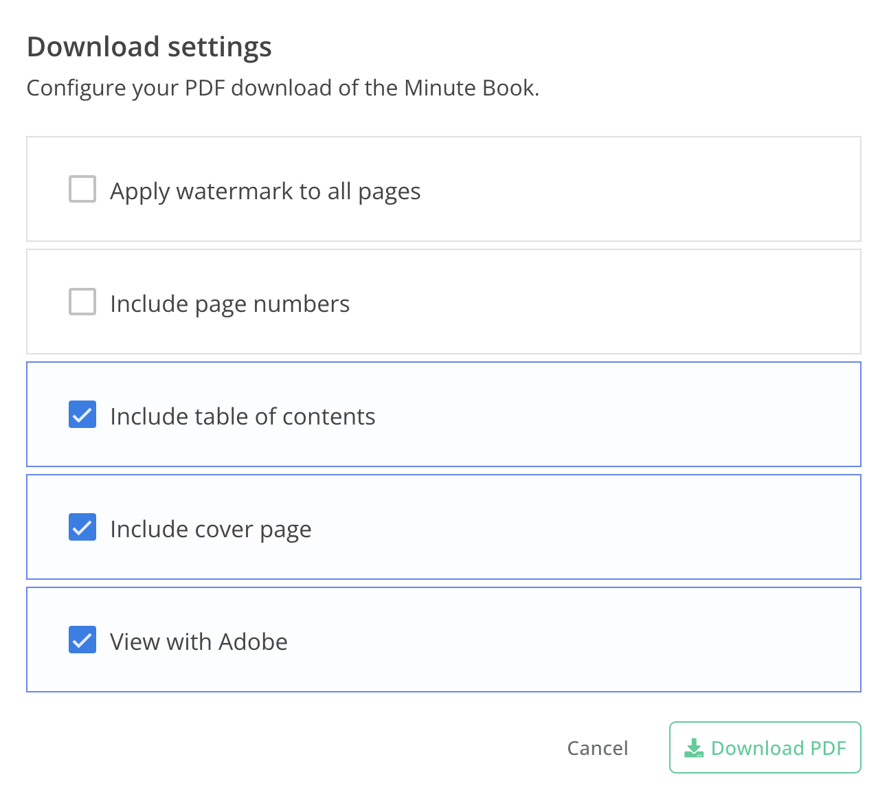 We’ve added a new "View with Adobe" option to the Download Settings when generating a Minute Book as a PDF.