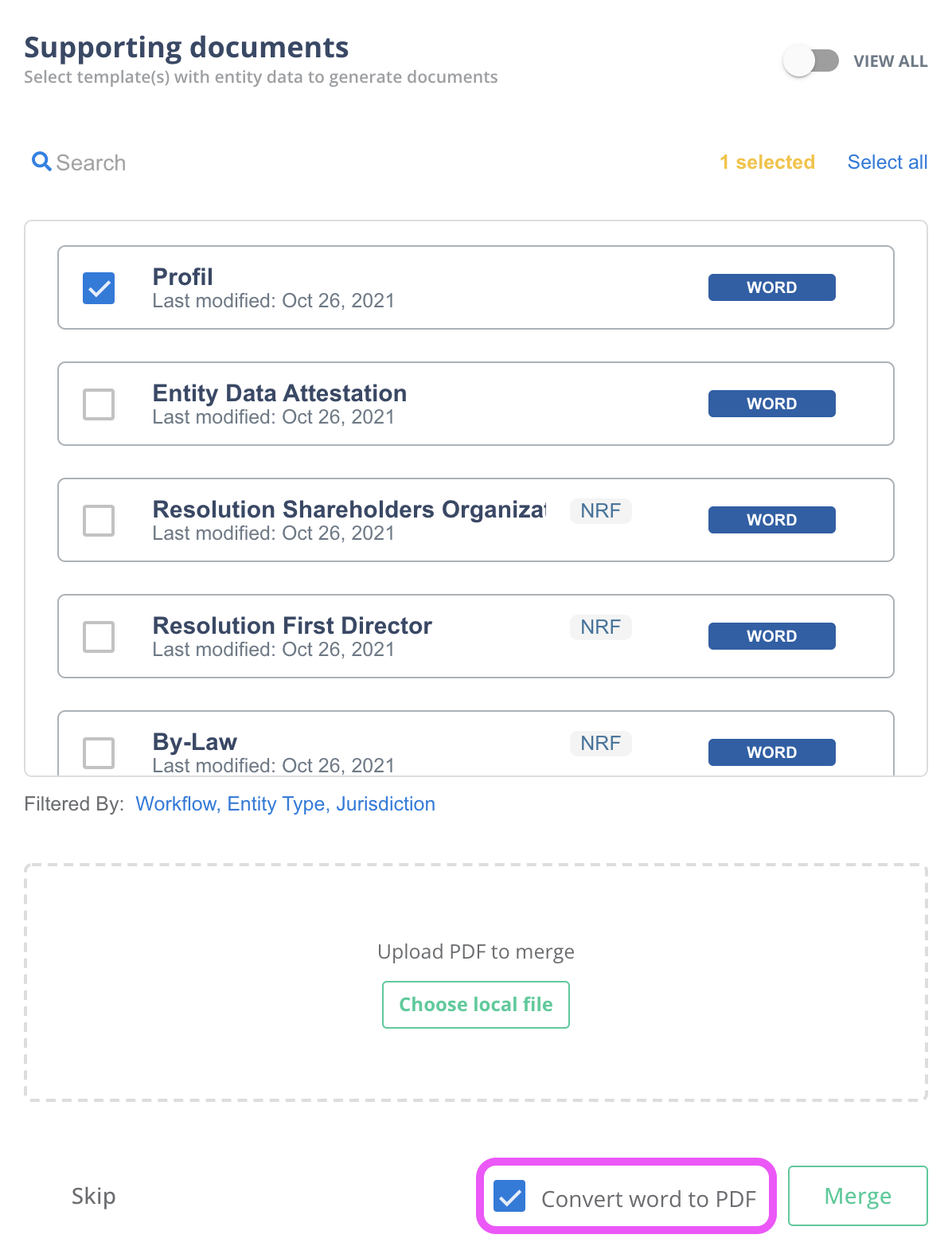 Have a template that you almost always convert from Word to PDF? Well, now you can skip the pesky step of generating it as a Word document! Before you merge the documents, just be sure to tick the “Convert word to PDF” box, and presto, any Word documents selected will be generated directly to a PDF.