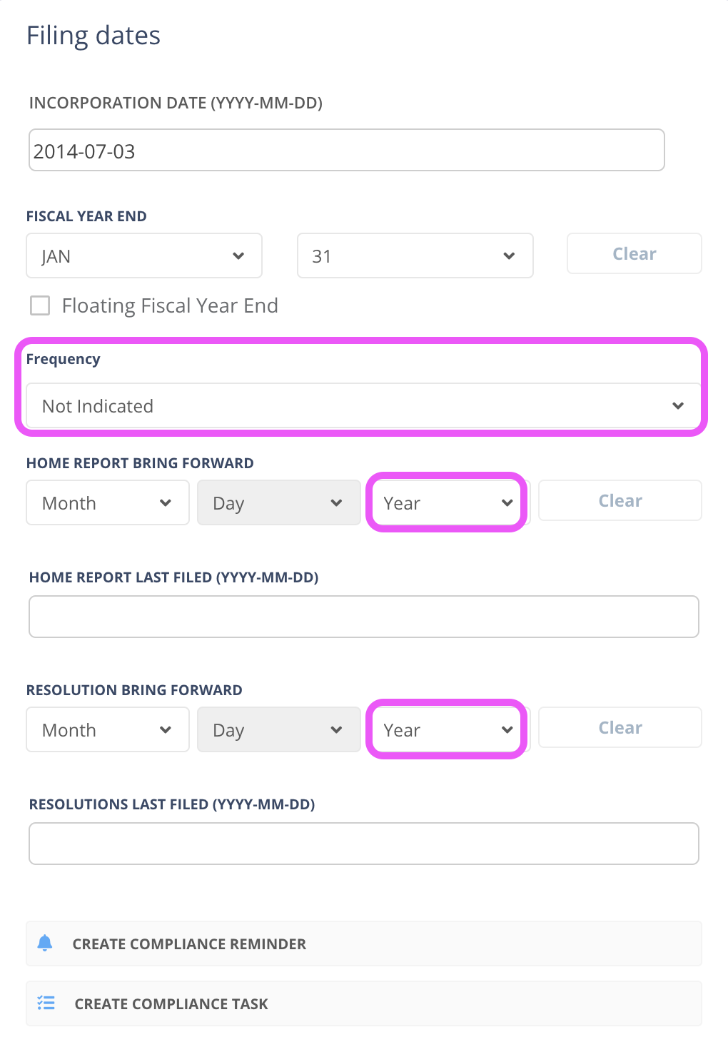 Bring Forward dates aren’t always an annual event. To help you accurately manage those filings with a biennial, 5 year, or any other schedule you encounter, we’ve added the Year as an optional field to the HOME REPORT BRING FORWARD and RESOLUTION BRING FORWARD fields under Filings dates in the Compliance section of your entities. Additionally, we’ve included a field so you can indicate the filing frequency specific to each entity.