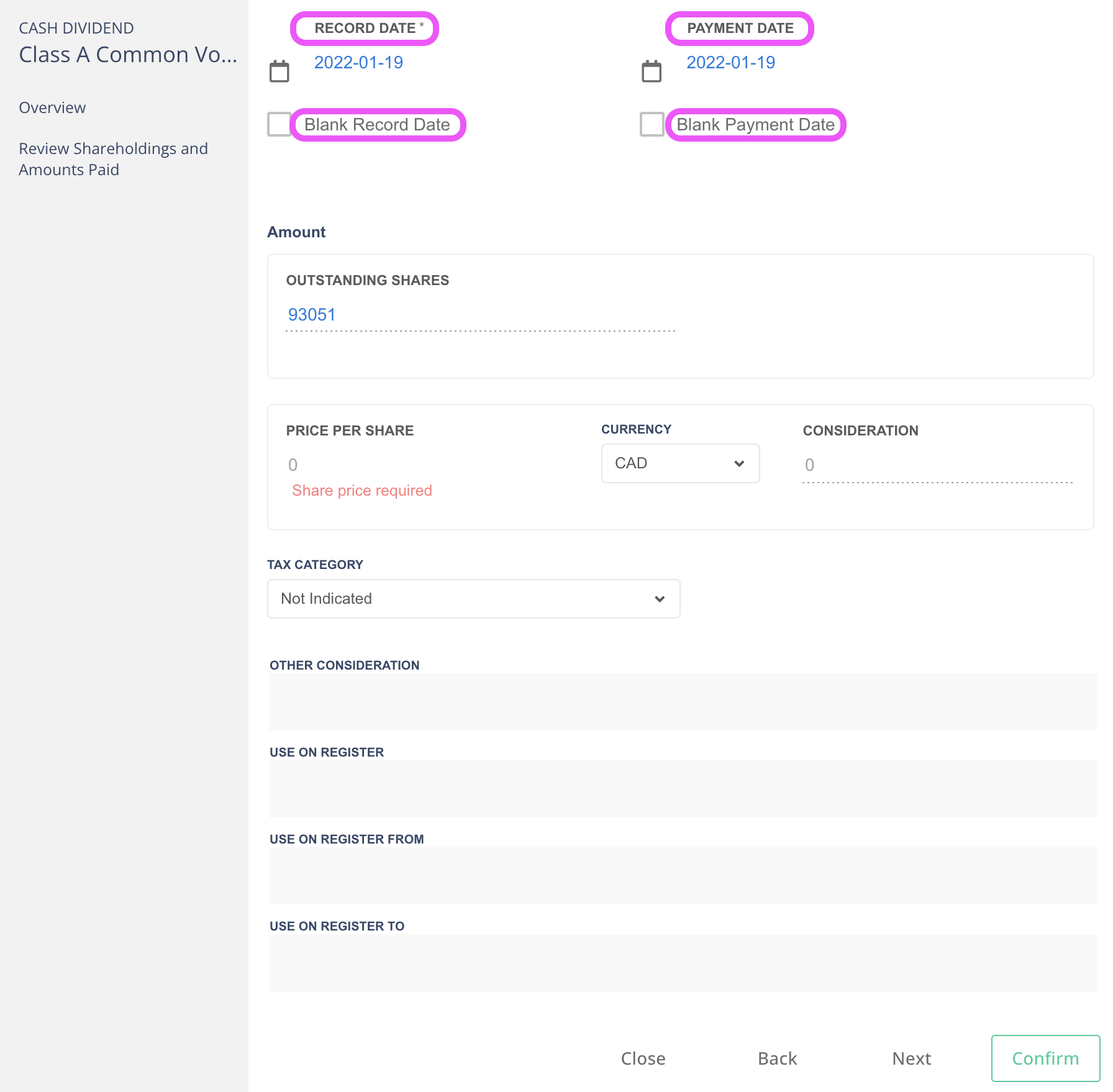 To better communicate what the date fields in a Cash Dividend transaction represent, we changed the Transaction Date to Record Date and Resolution date to Payment Date.