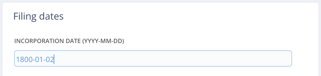 The date selector for formation/incorporation dates only allows you to go 100 years back. That may seem like a long time ago, but we know some of you have entities that long pre-date that. If you’ve got a golden oldie, instead of using the date picker, type in the date (YYYY-MM-DD) in the Formation Date field, hit enter, and you’ll be good to go!