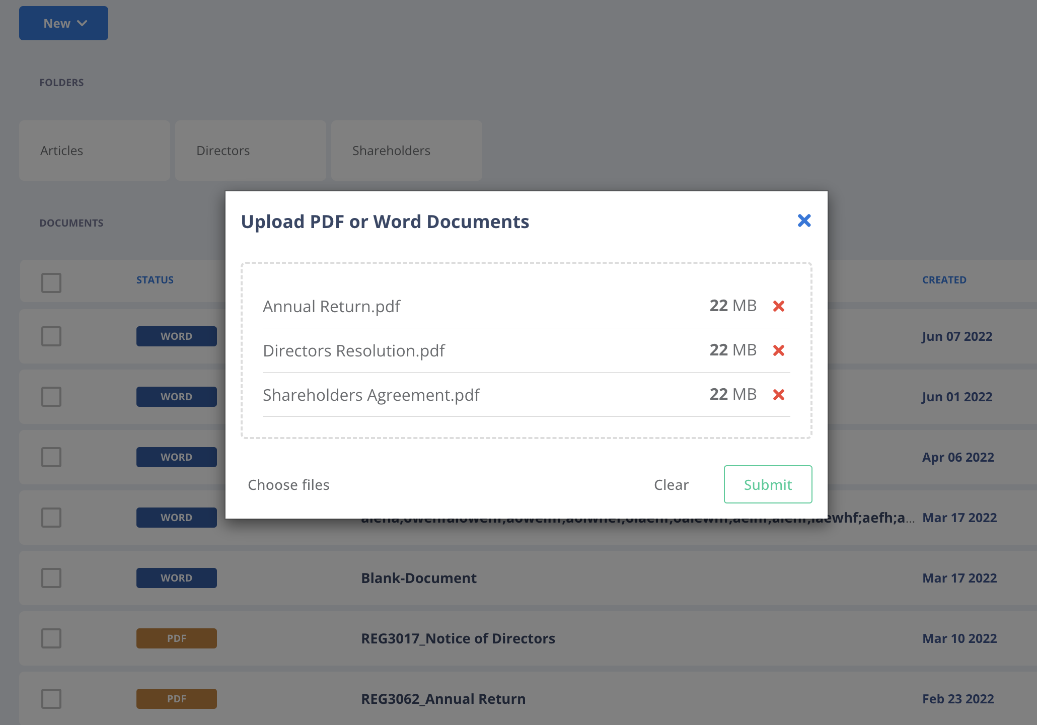 Enter the new list view when uploading documents! You can now clearly see the full document name and size, while easily removing selected documents before uploading, all in our clean, new upload view.